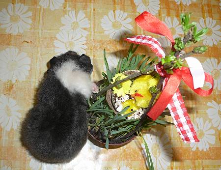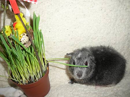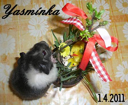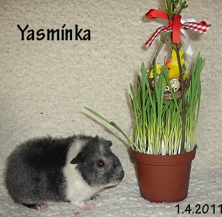 Krásná šedá GENOVÁ SKINNIČKA s VP od Yoriky, ( otec Aladin ), narozena 4.2.2011 . K 1.dubnu váží 320 g. Mírné, klidné povahy. V pátek 15.4.2011 odvezena do nového domova k Žatci